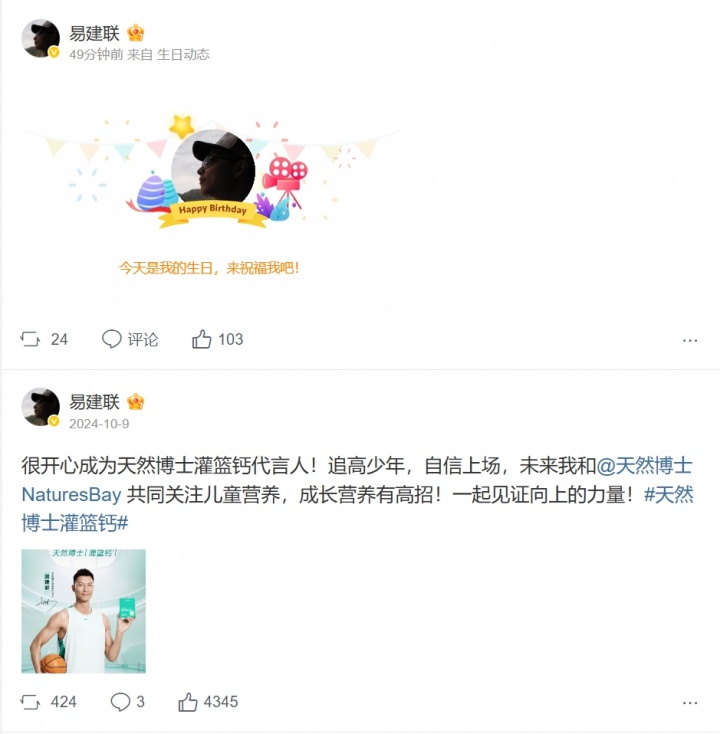 去年的生日期间易建联并未更新相关生日动态。10月27日,易建联迎来个人的38岁生日。